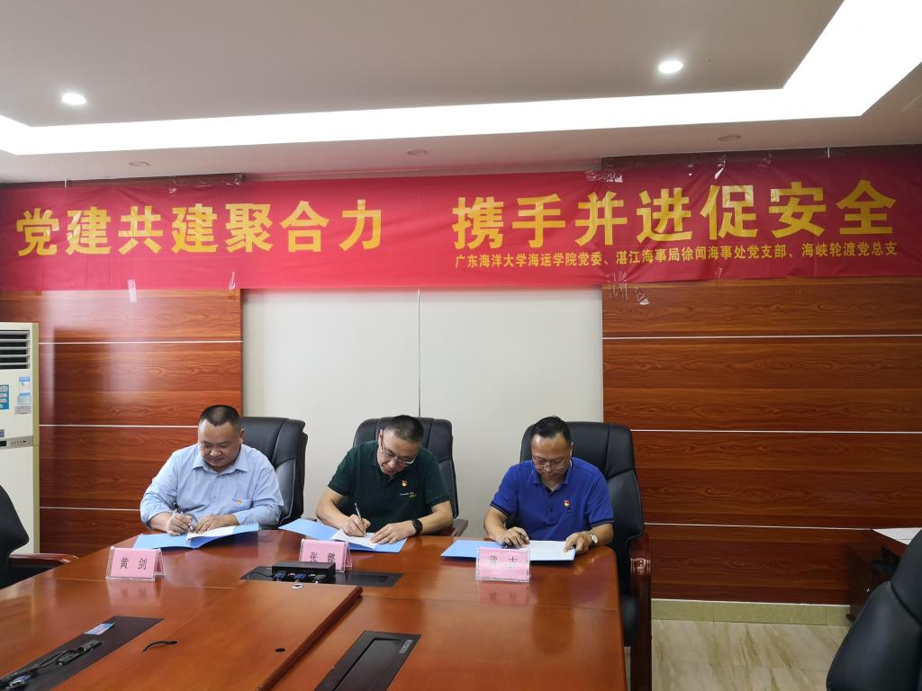 实验教学中心教工党支部、湛江海事局徐闻海事处党总支、海南海峡航运股份有限公司信海船队党总支签订,现已形成了互带互动、优势互补、资源共享、共同发展的校政企三方党建工作新格局,党建共建成果“校政企三方闭合联动,构建区域特色党建品牌”入选教育部第二届全国高校“两学一做”支部风采展示活动教师党支部推荐展示精品成果(全国共10件)。随着共建活动的不断深入、党建引领内涵式发展需要以及组织机构名称变更,三方决定在现有共建成果的基础上提升党建共建平台,重新签订三方协议,在科学研究、社会服务、人才培养等方面更加深入地开展共建,共同为“黄金水道”琼州海峡保驾护航。