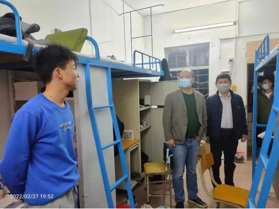 为做好2022年春季学期返校工作,推进米高梅 疫情防控的各项部署,加强对返校学生的管理,强化学生疫情防控意识,2月27日晚,海运米高梅 院长贾宝柱、副书记齐昊带领辅导员、半军管干部及班主任深入学生宿舍走访慰问。
