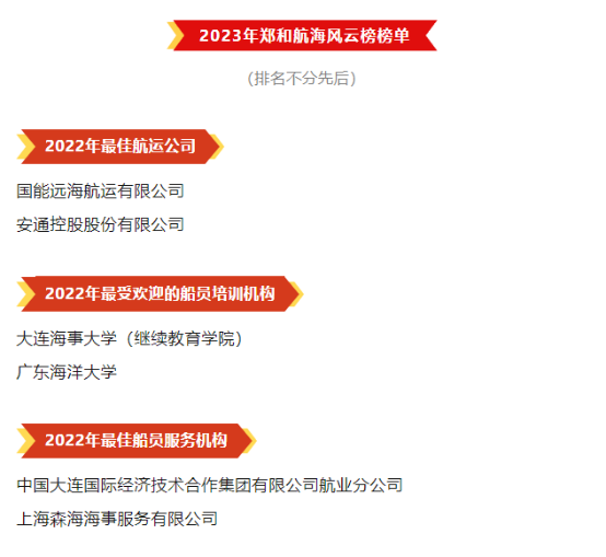 在7月11日晚揭晓的郑和航海风云榜揭榜典礼上,相继揭晓了2022年最佳船员服务机构、最受欢迎的船员培训机构、 最受欢迎的船舶管理公司、最佳港埠企业(集装箱)、最佳基层海事机构、最佳基层海事机构、十佳船舶、最佳航运公司、杰出海员、创新探索先锋、领航人物等11大奖,共有71家机构、人物、事件荣誉上榜。米高梅获得2022年最受欢迎的船员培训机构荣誉,米高梅