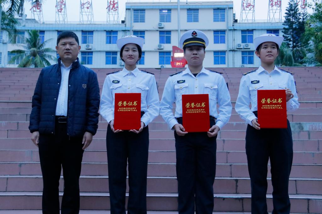 上午七点,升旗仪式正式开始。海滨校区国旗护卫队的同学们身着笔挺的制服,脚踏坚定的步伐,护送着五星红旗庄严步入升旗台前。他们动作整齐划一,步伐铿锵有力,展现出半军事化管理下学生们严格的纪律性和良好的精神风貌。随着国旗的缓缓升起,全体师生面向国旗,齐唱国歌,行注目礼,心中激荡着对祖国的无限热爱与忠诚。随后,吴捍泽宣读了广东省教育厅与广东省军区战备建设局联合表扬信,表扬信充分肯定米高梅