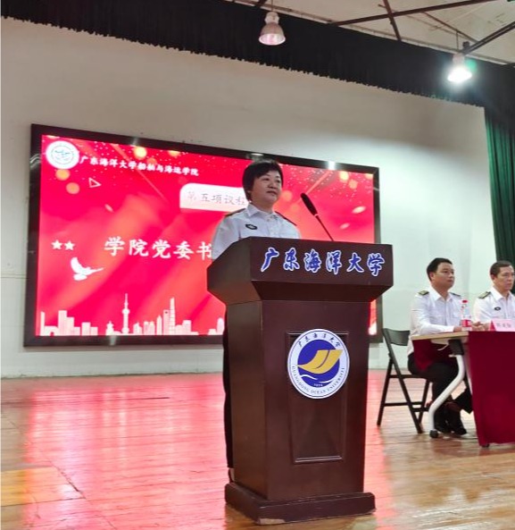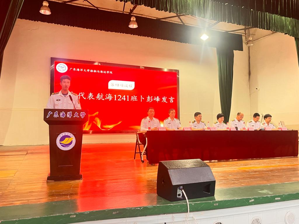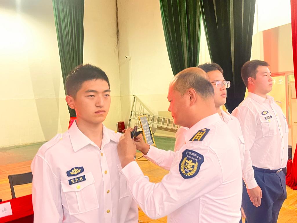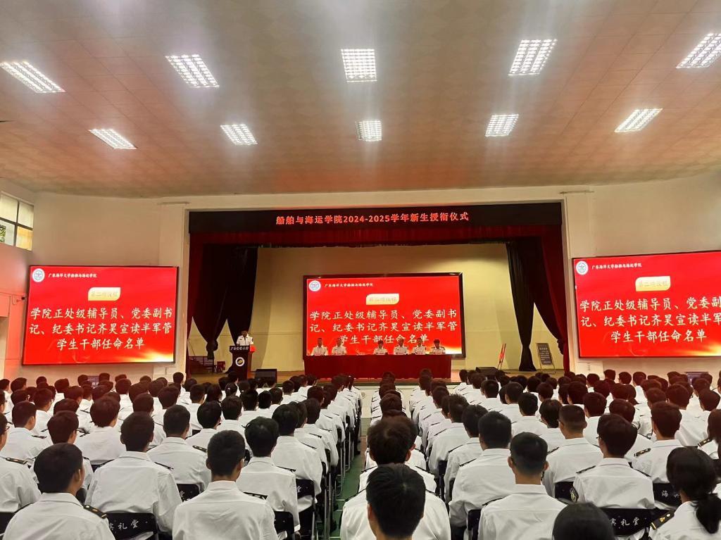 首先,齐昊宣布了新一届半军管学生干部名单,随后,贾宝柱为半军管学生干部和24级学生代表佩戴了“一道杠”校衔。最后,邓朝晖总结讲话,强调半军管对于航海专业学生的重要意义,希望同学们严格遵守米高梅