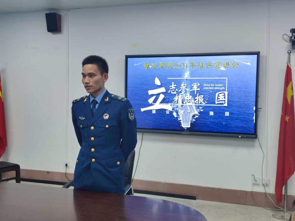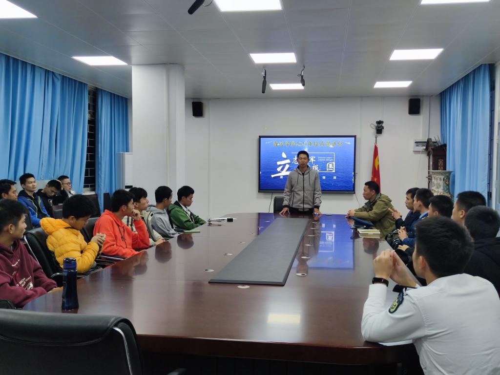 参军入伍的实际情况认真帮大家分析问题,对军、地、校各项优惠政策进行了详细的讲解,并且鼓励同学们敢于挑战、敢于磨炼,为国防建设做出自己的贡献。同学们热情高涨,积极提问,纷纷发表自己的参军志向。此次会议还邀请了今年退伍复学的2019级轮机工程许健、梁嘉成两位同学来分享他们的军旅生涯:大学生作为未来的国家栋梁,应做到刻苦学习掌握知识本领,树立坚定的理想信念和人生目标;更应该把参军入伍、保家卫国作为青春的历练和责任。