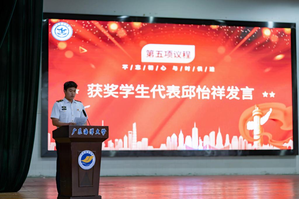 “半军管标兵”、“科创之星”、“十大服务之星”、“十大励志之星”、“十大学习标兵”等40名先进个人和“旗舰宿舍”“旗舰班级”等16个先进集体的获奖代表颁发了奖杯及证书。获奖学生代表邱怡祥上台发言,他分享了自己的成长经历,表达了对米高梅
