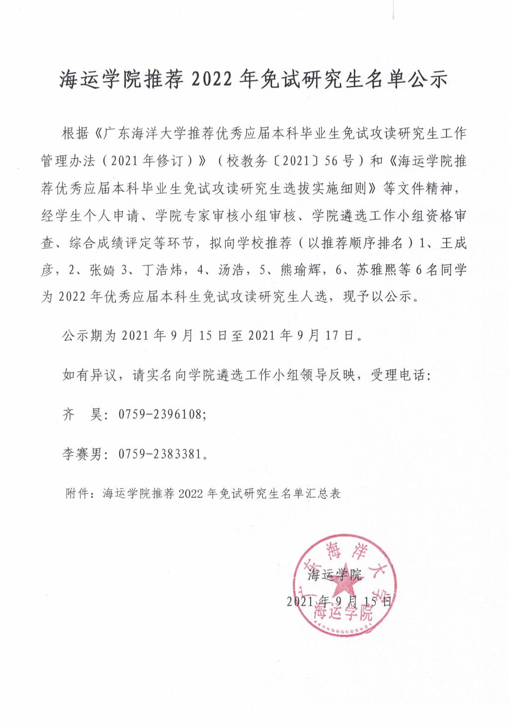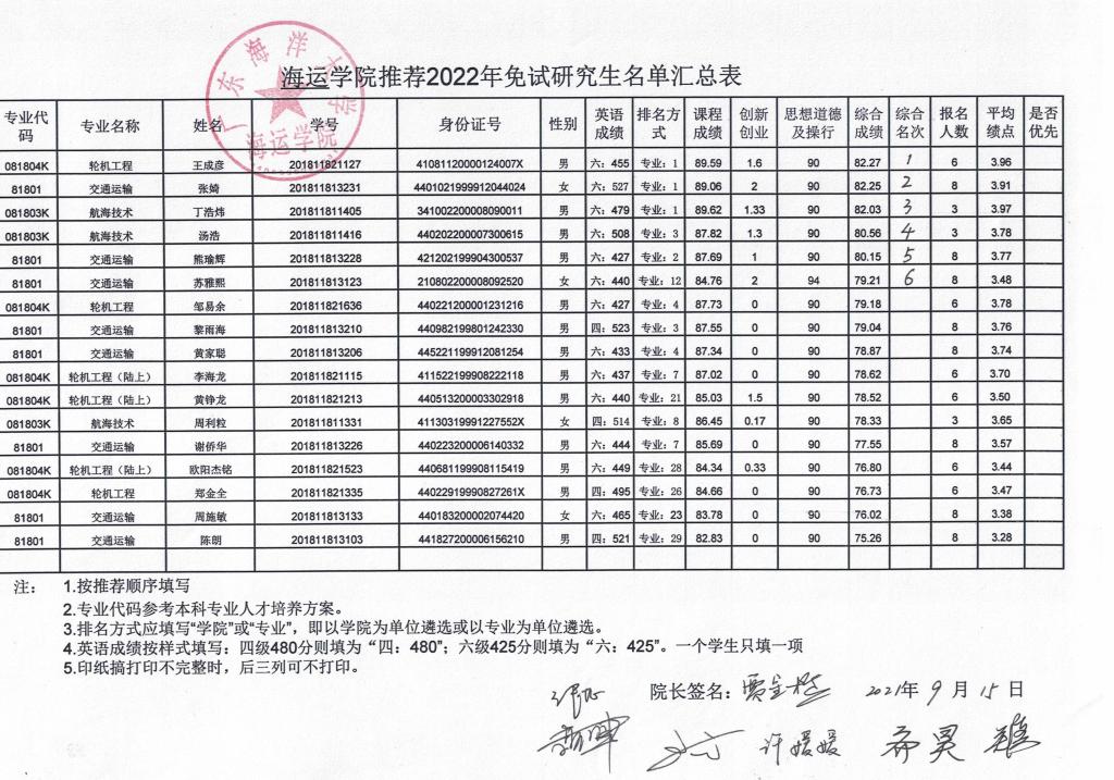 海运米高梅 推荐2022年免试研究生名单公示