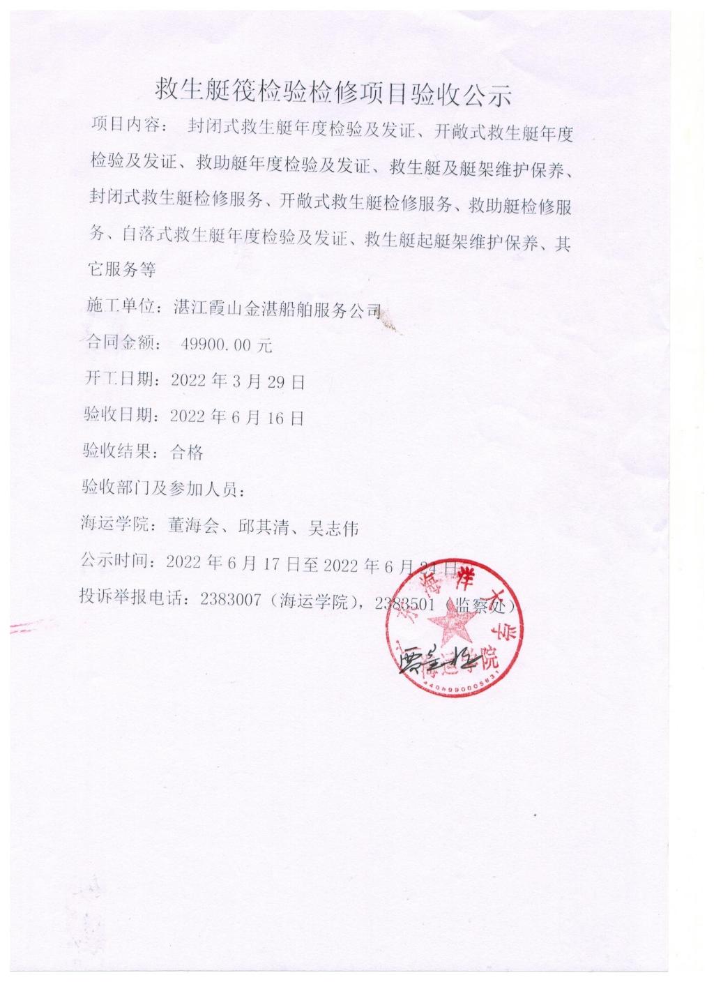 救生艇筏检验检修项目验收公示