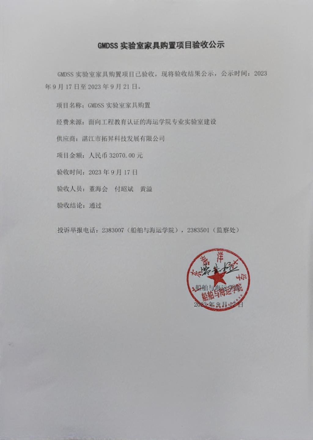 GMDSS实验室家具购置项目验收公示