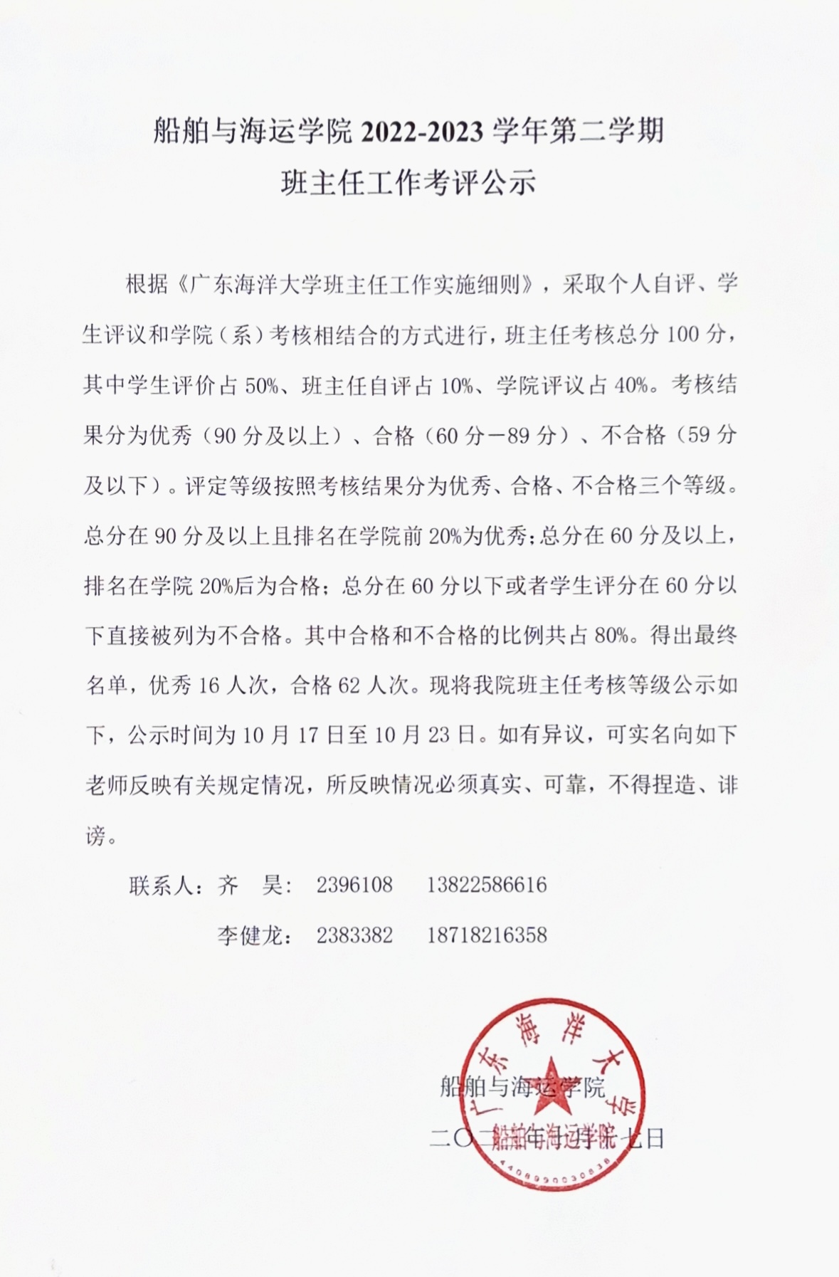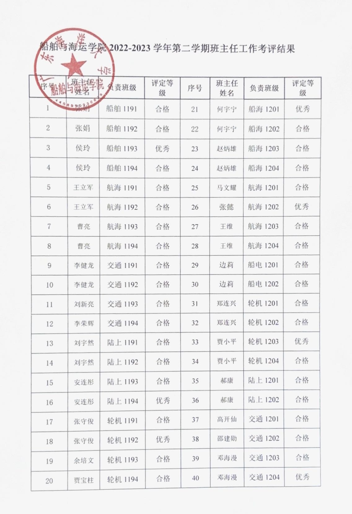 米高梅 2022-2023学年第二学期班主任工作考评公示