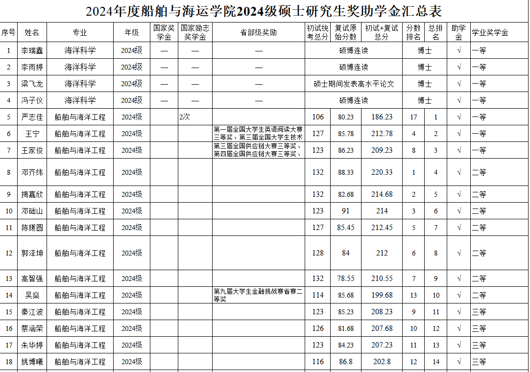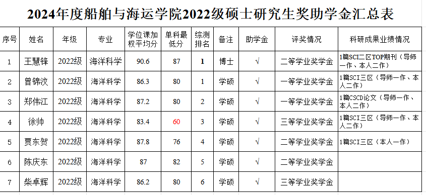 评审小组认真审核及严格评选,拟确定获得研究生助学金、学业奖学金人员名单。其中,2021级海洋科学专业皮桂源同学因休学补发半年助学金,其余硕士研究生均不分等级全部获得助学金。现将评审名单进行公示(详见附表)。