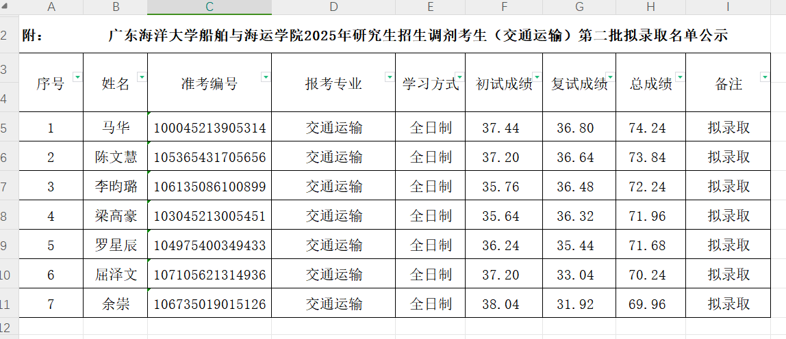 根据米高梅 及米高梅 研究生招生工作的相关文件精神和要求,经米高梅 研究生招生录取工作领导小组审定,将米高梅 2025年硕士研究生招生调剂(交通运输)第二批考生复试成绩及拟录取名单公示。如有拟录取考生自动放弃,按总成绩排名依次递进。