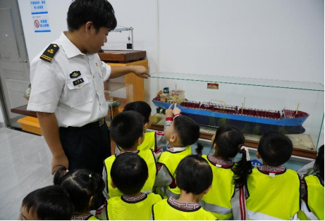 最后,小朋友们走进航海船模室。各种各样精致的船模让他们眼花缭乱,志愿者向小朋友们介绍了不同船模的类型和用途,比如集装箱船可以运输很多货物,连接世界各地。小朋友们兴奋地在船模间穿梭,仔细观察,对航海运输有了更直观的认识。
